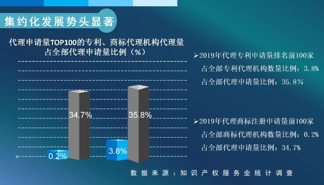 2019年代理专利申请量排名前100家的专利代理机构(占全部专利代理机构数量的3.8%),代理的专利申请量占2019年全部代理申请量的35.8%;2019年代理商标注册申请量前100家的商标代理机构(占全部备案商标代理机构数量比例不到0.22%),其代理商标注册申请量占2019年全部代理申请量的34.7%。超过一半的知识产权服务机构集中在北京等5个省市。